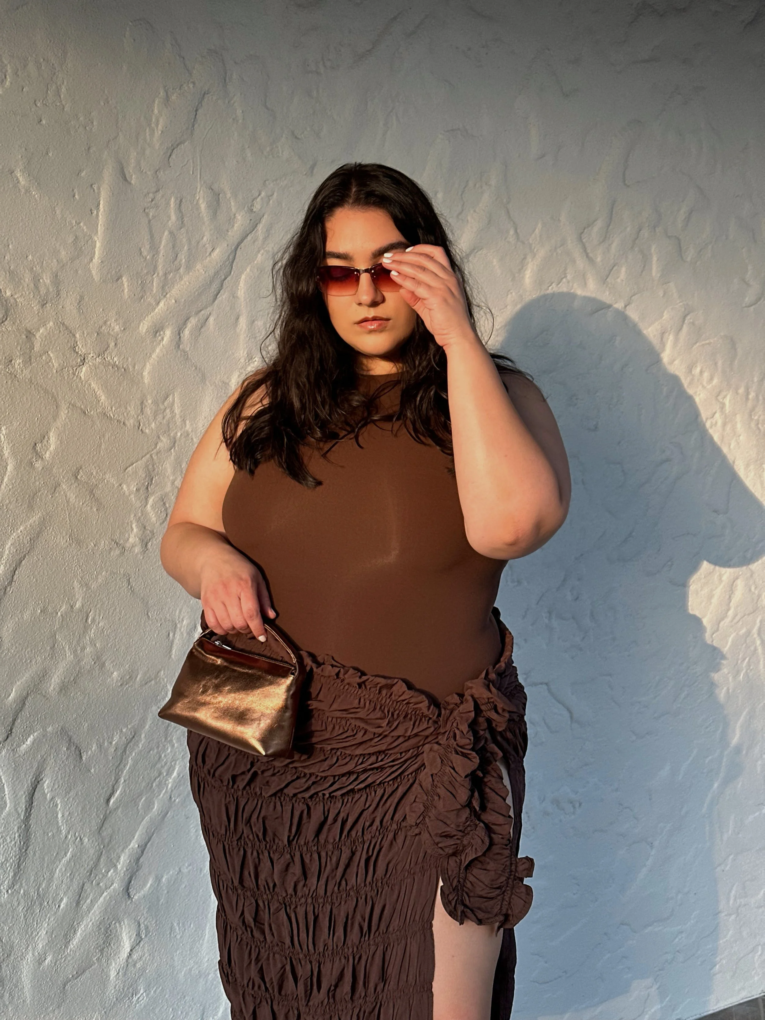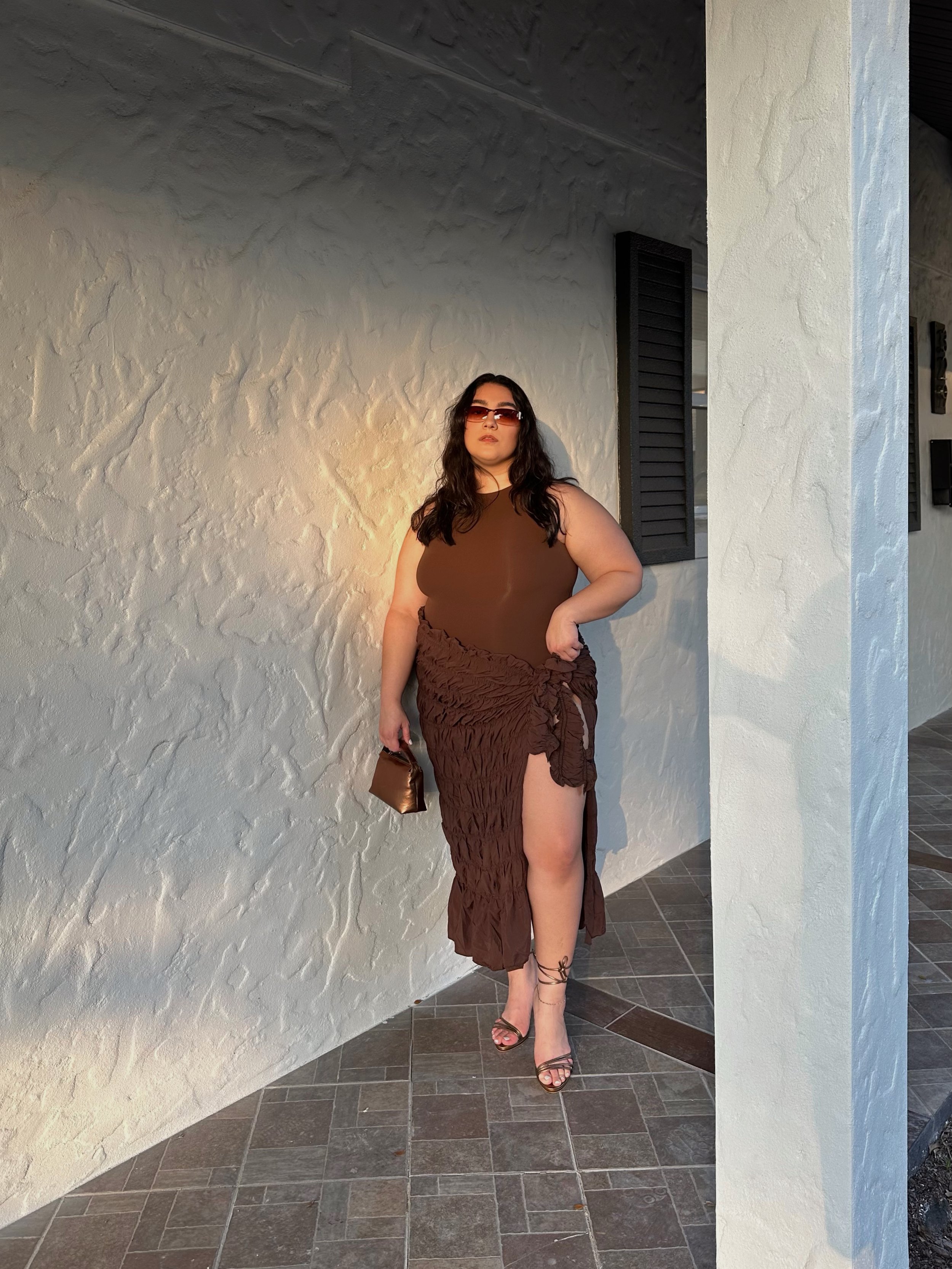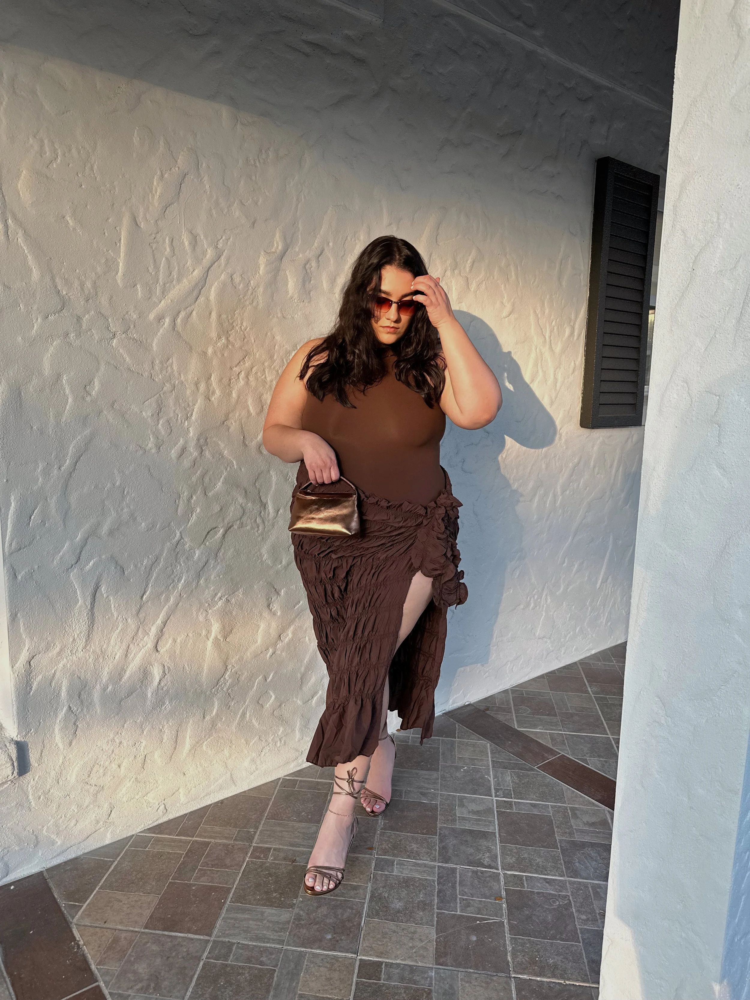 Okay, in love with this wrap skirt. I got so many colors for Summertime to play with all of my swimsuits. It’s already so stretchy but the fact that it ties on the side creates that super cute high slit. You can check our the color skirt colors HERE. I got white, pink, orange, and black also!