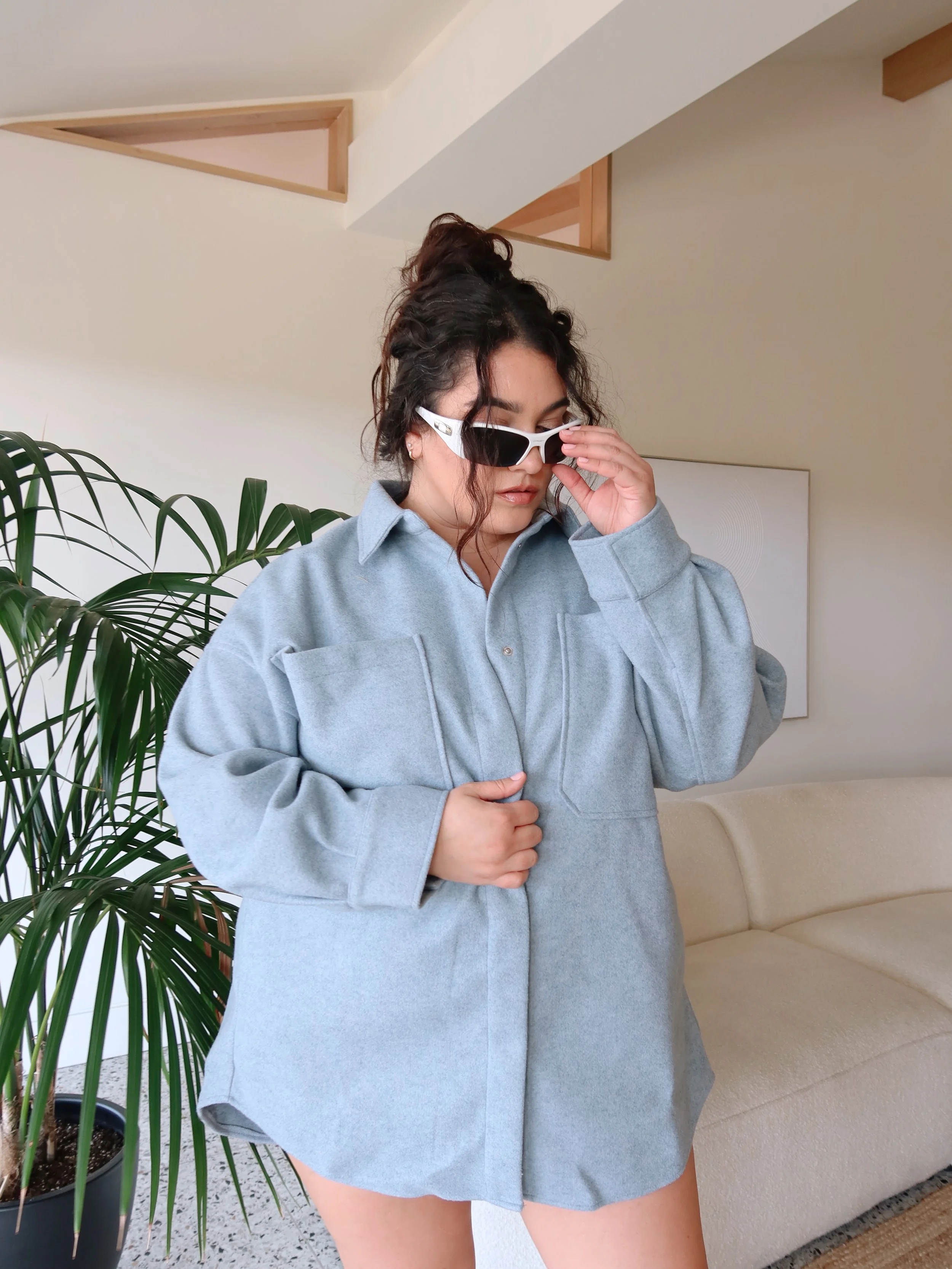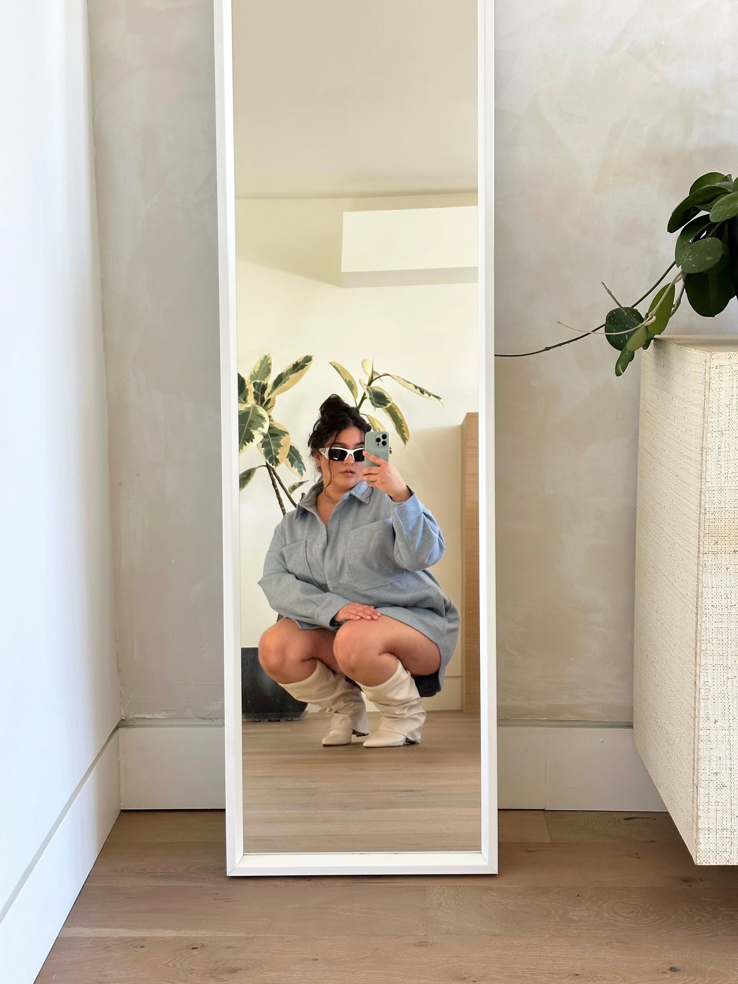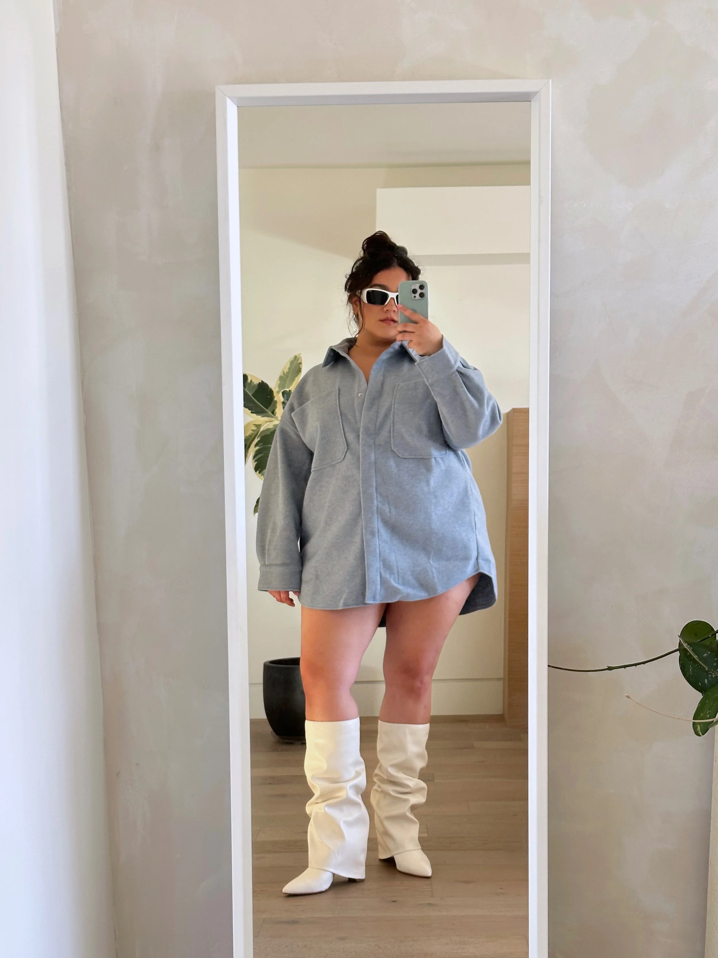 Oh you know, I’m all about an oversized top with a good pair of boots. I think blue is my color by the way. When I posted these white boots, someone said Britney Spears recently wore ones like them and I’m honored. I always wear a tiny pair of short shorts that are stretchy under my oversized dresses and tops just for more comfort. I was feeling myself this day, clearly, because I have 823409 photos from it. lol.